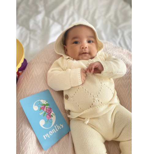 La petite perle, un trousseau de naissance complet en coton biologique fabriqué à partir de matériaux issus à 100% de l'agriculture biologique garantis, sans OGM, sans pesticides, sans métaux lourds et sans produits cancérigènes. , tricoté en point mousse pour les premiers mois de bébé.